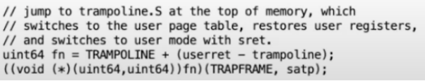 这是内核返回到用户空间的最后的C函数。C函数做的最后一件事情是调用fn函数,传递的参数是TRAMFRAME和user page table。在C代码中,当你调用函数,第一个参数会存在a0,这就是为什么a0里面的数值是指向trapframe的指针。fn函数是就是刚刚我向你展示的位于trampoline.S中的代码。