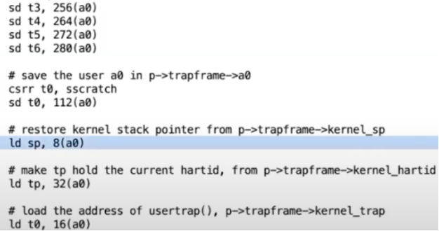 这些指令是内核在supervisor mode中将要执行的最开始的几条指令,也是在trap机制中最开始要执行的几条指令。我们实际上已经执行了位于trampoline page最开始的一条指令,也就是csrrw指令,我们将要执行的是第二条指令(sd指令)。