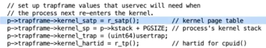 接下来的几行填入了trapframe的内容,这些内容对于执行trampoline代码非常有用。这里的代码就是:
