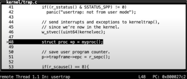 可以看到t0的位置对应于一个叫做usertrap函数的开始。接下来我们就要以kernel stack,kernel page table跳转到usertrap函数。
