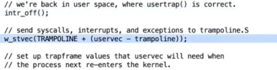 在内核中执行任何操作之前,usertrap中先将STVEC指向了kernelvec变量,这是内核空间trap处理代码的位置,而不是用户空间trap处理代码的位置。