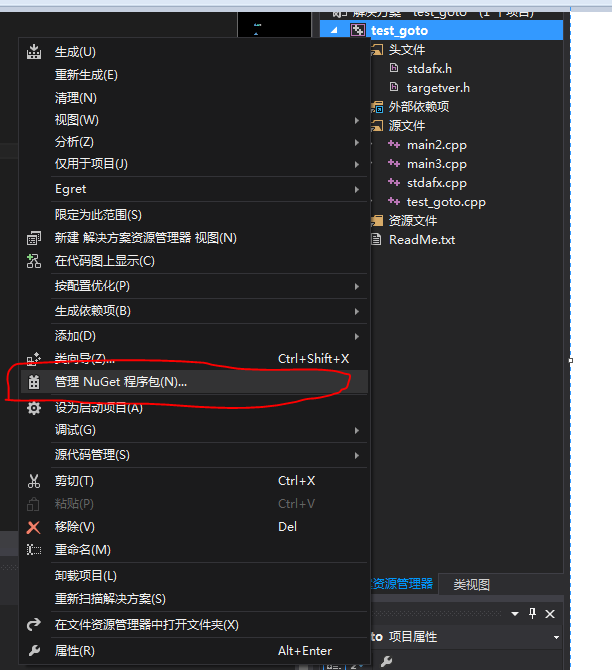 2.如果你下载的项目没有 测试包,一般名称是“packages”,可以右键项目,找到“管理NuGet程序包(N)”,然后找到Google Test 相关包,安装。