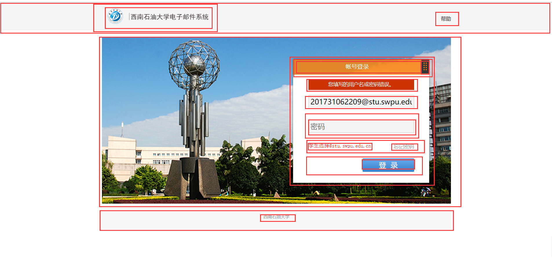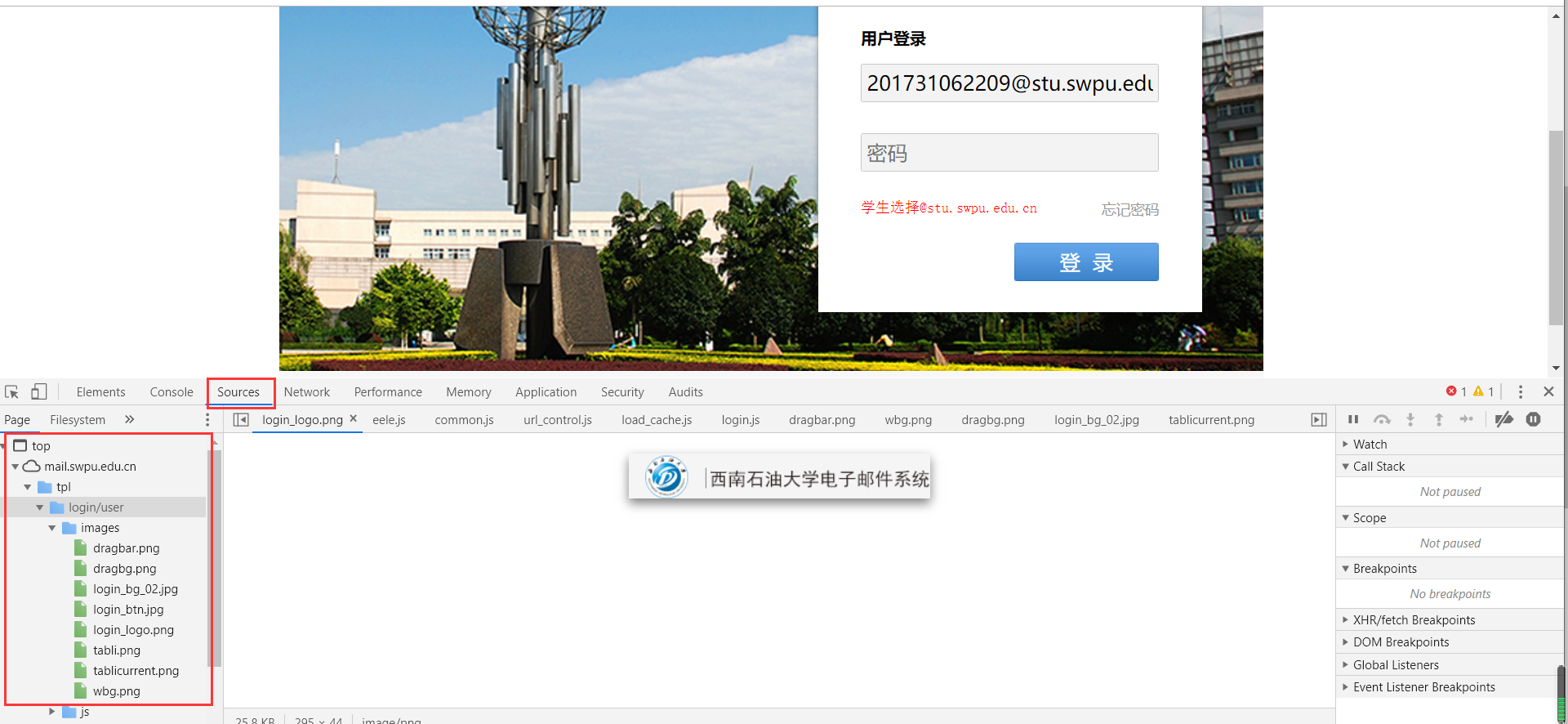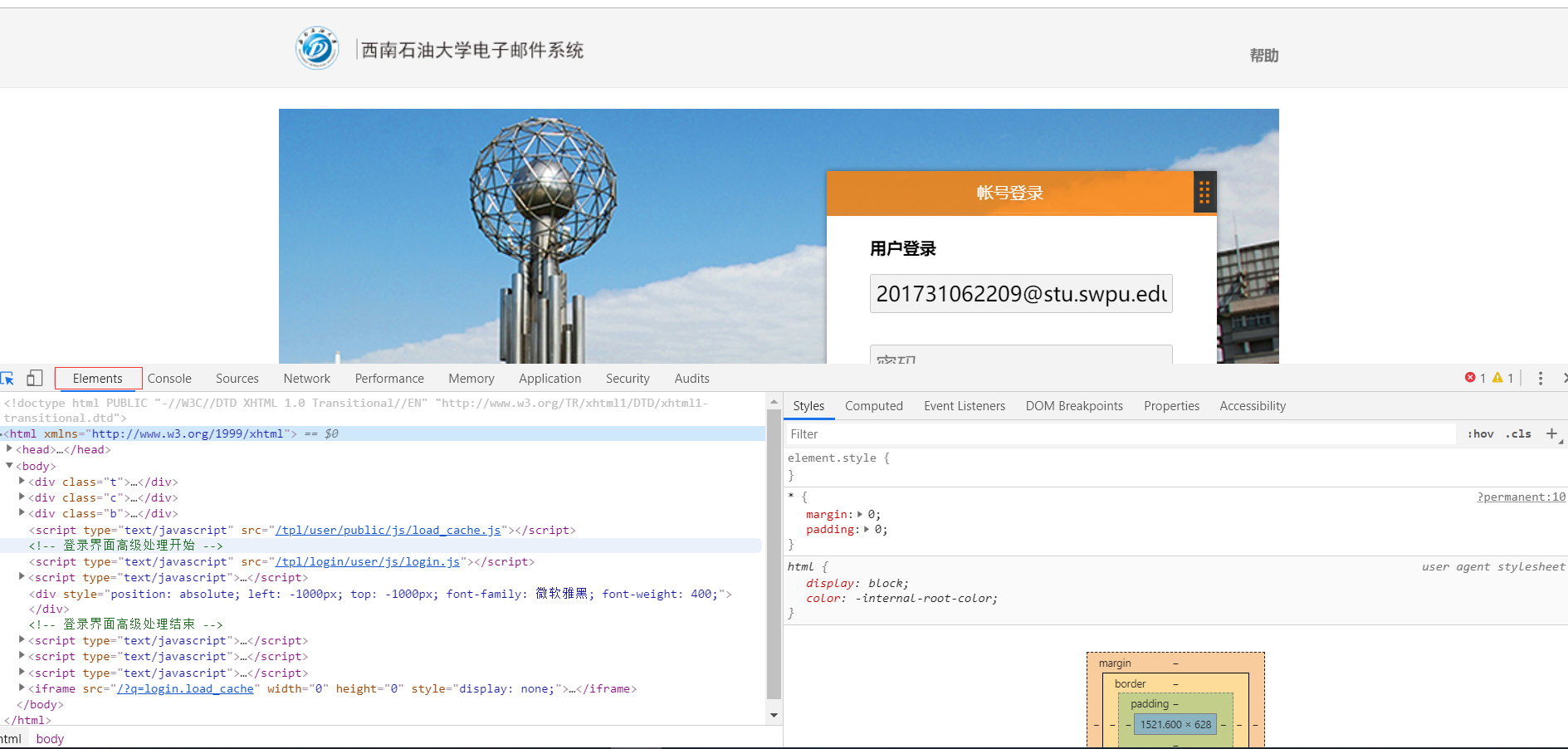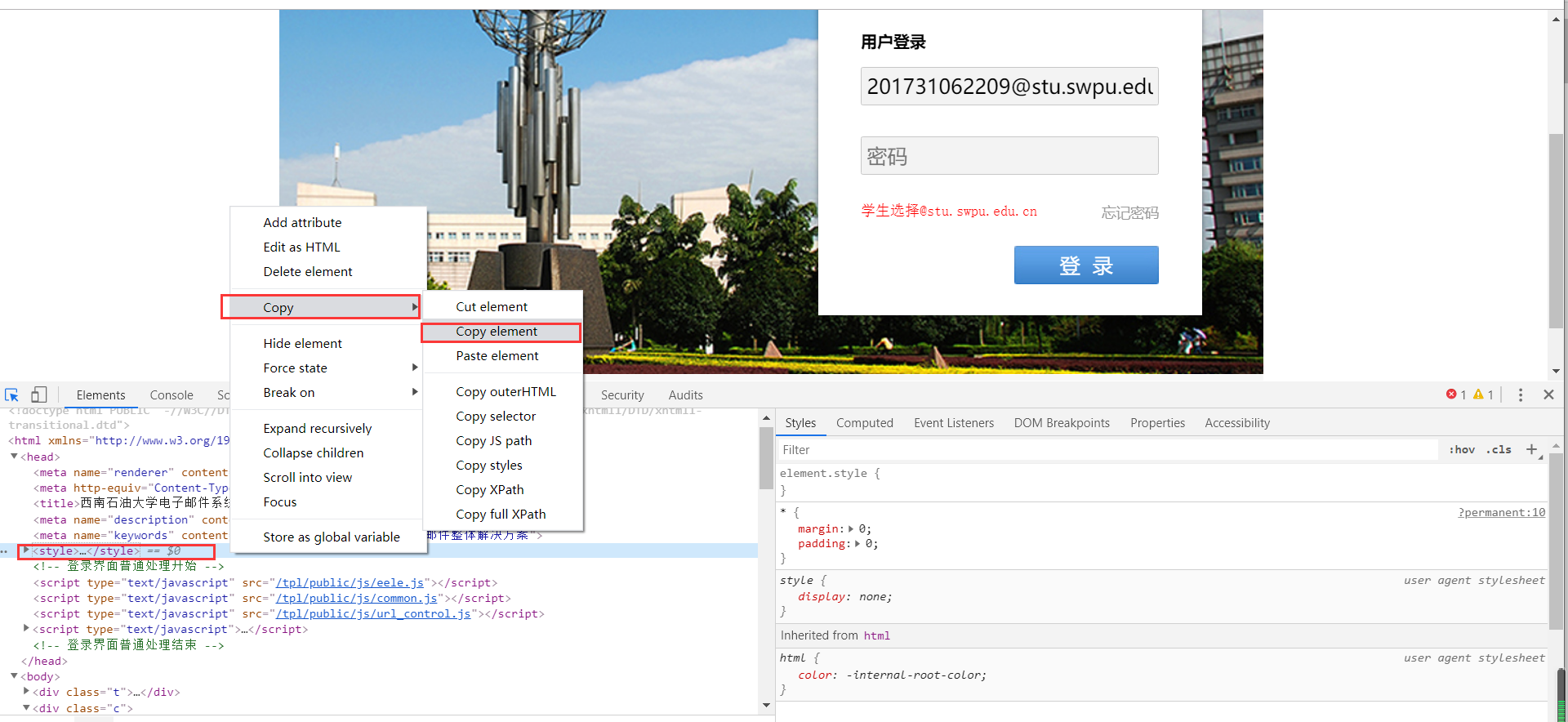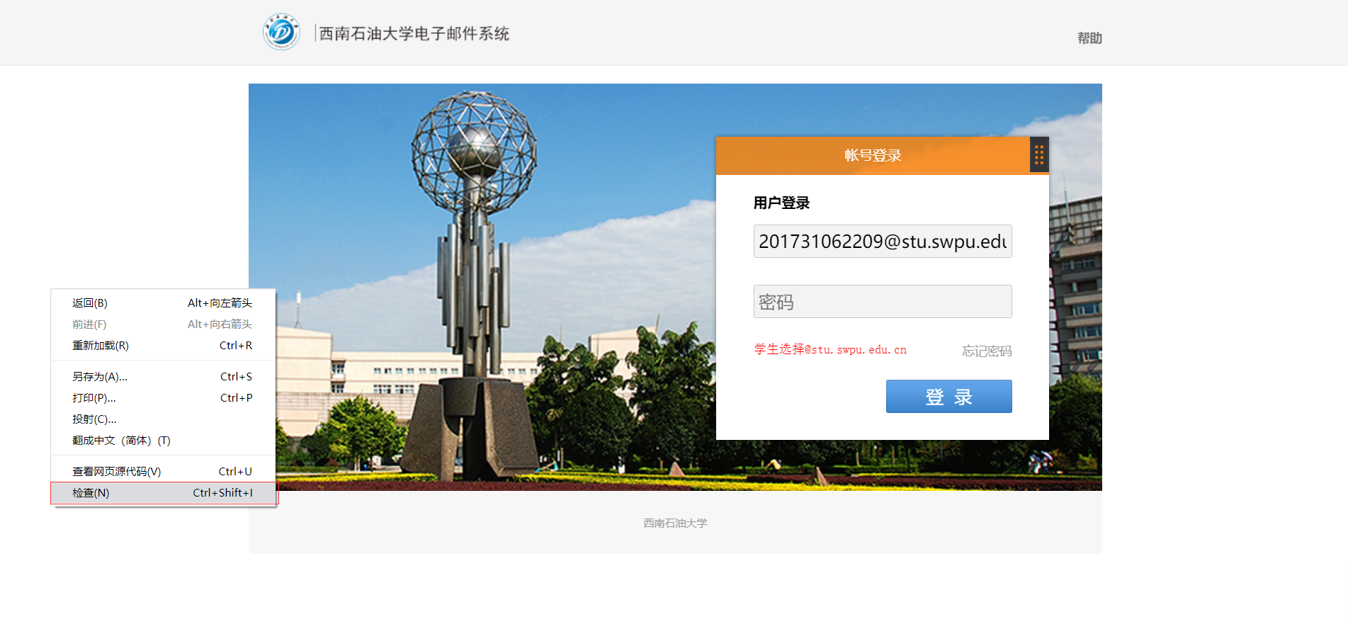 1、打开原网页http://mail.swpu.edu.cn/,右击->检查