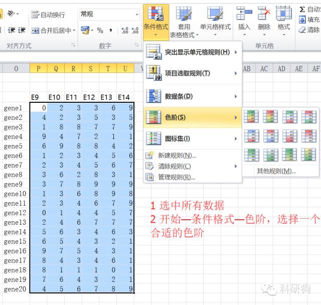 2. 选中表达数据,执行 开始—条件格式—色阶 选择一个合适的色阶: