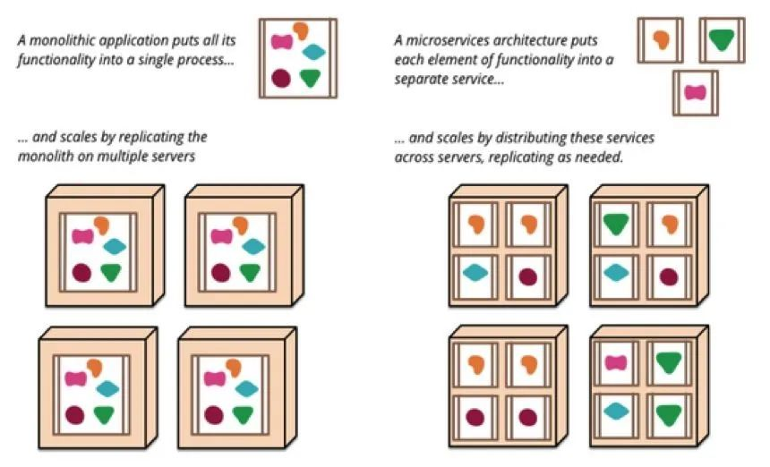 正因为单体应用的缺陷,才有了微服务。微服务和单体应用的区别,可以用Martin Fowler的这张图来解释: