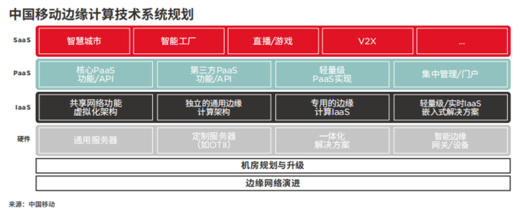 中国移动的边缘计算系统规划包含服务与应用(SaaS)、PaaS 能力、IaaS 设施、硬件设备、站点规划、边缘网络演进。边缘计算的 PaaS、IaaS 和硬件平台需要设计成兼容两种应用生态系统,即公有云应用和原生边缘应用。对于边缘计算部署的不同位置,上述领域均有望自定义地选择所用技术。