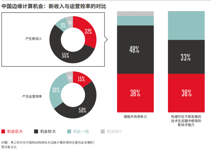 中国关于边缘技术的思考中,新收入占据主导,近 90% 的受访公司将边缘计算视为 5G 时代创造增量收入的机会。大多数公司期望通过提供边缘计算所需的边缘技术(硬件、软件和平台),向终端用户提供边缘服务和应用程序来产生新的收入。边缘计算除了对新收入有直接贡献外,它对传统核心业务而言,无论是云还是电信,都有间接益处。技术生态系统正在不断发展,通过构建可运用的新技术能力,提供更广泛的服务,有助于强化市场竞争力。