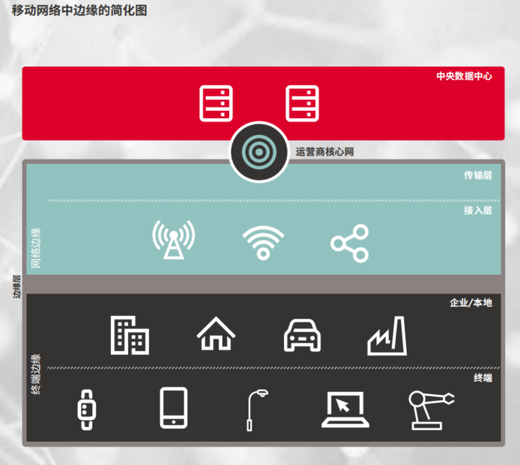与完全基于云的传统模式相比,边缘系统架构将存储、计算、处理和组网等云功能推进生成或使用数据 的设备。对于移动网络来说,“接近”是一个相对概念,它可以是比较近的位置(即在传输网中),也可 以是客户所处的位置(无论在用户设备内部还是在用户驻地)。