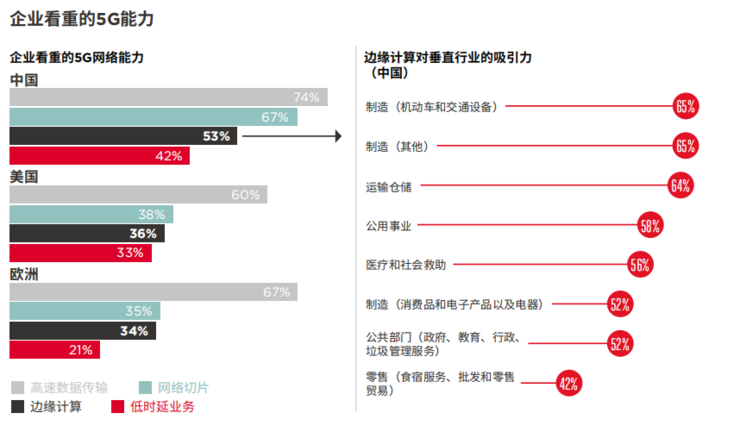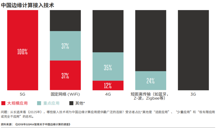 在调查中,5G 被视为关联最密切的边缘计算接入网络。5G 将广泛应用于边缘用例,支持率远远高于其他网络接入技术。GSMA 智库全球边缘计算调查(2018年)也曾强调,5G 是边缘用例的领先技术,但是与4G 和固网差异较小。这个调查结果不仅反映了中国 5G 网络部署 的快速,也反映了中国将利用 5G 技术推动行业和企业数字化转型的雄心。