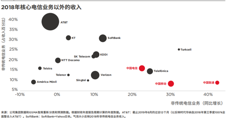 对于全球大部分主要运营商而言,核心移动业务和固定业务占收入的 80~90%,而非传统电信业务占收入 的 10~20%。也存在一些例外情况,例如 AT&T、韩国电信和日本软银 SoftBank(非传统电信业务的收入占比分别约为 40%、30%,其非传统电信业务收入源 于并购而非来自有机增长。