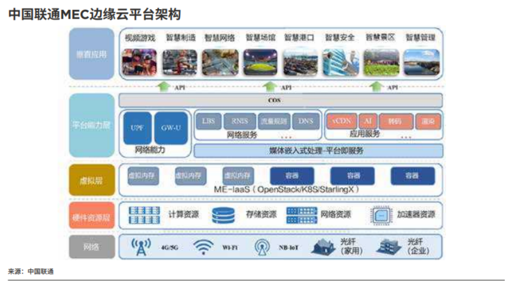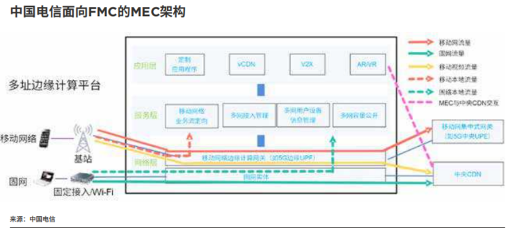 中国电信提供广泛的移动和固网业务(二者收益相当),并规划将边缘计算应用于移动和固网业务。更具体地说,为缓解网络流量造成的回传压力,并保证固网和移动网用户体验一 致,中国电信正在构建统一的 MEC,通过利用现有固网资源优势,实现固定和移动网络的边缘融合(传输和内容交付网络-CDN)。平台可以根据服务类型或需求,灵活地将流量分配到不同的网络,从而通过多网络共享边缘 CDN 资源提升用户体验,实现内容的智能分发。