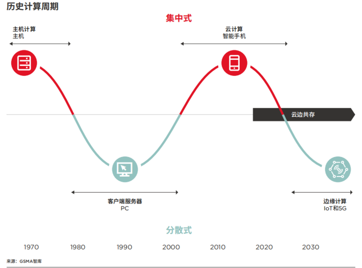 在过去 40 年里,算力和处理在集中式架构和分布式 架构之间交替往复。21 世纪,随着互联网、企业 IT和智能手机的大规模商用,激起了以大型集中服务器群为基础的云计算浪潮。一些公司成为这个领域的领军 者,即所谓的超大规模云计算玩家,包括亚马逊、微软和谷歌。近年来,其他公司也加入了这一市场,并正在迅速扩大规模,包括 IBM、Oracle 以及中国的阿里 巴巴和腾讯。