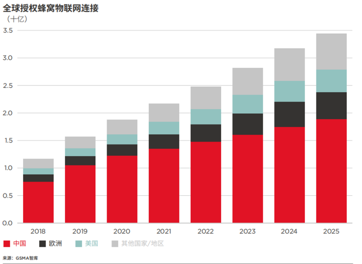 此外,中国是目前全球最大、最发达的物联网市场。中国授权蜂窝物联网连接约占全球三分之二(2019年),超过10 亿。此外,四分之三的中国企业已经部署了物联网,全球占比最高。中国也是推动全球物联网市场发展和增长所需技术的主要供应商,包括传感器、微芯片和其他组件。