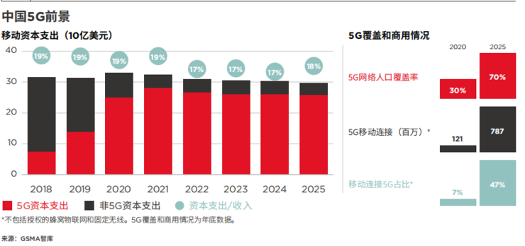GSMA 智库预测,到 2025 年,中国将拥有全球最大的 5G消费用户市场,5G 用户数将接近 8 亿,占全国移动连接数的 50%。为满足 5G 业务对网络的需求,2018 年至 2025 年,中国运营商将投资 2500 亿美元用于移动网络资本支出,其中 1800 亿美元将用于 5G 网络。中国将占全球近 20% 的 5G 网络投资。