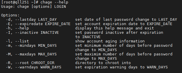 [root@qll251 ~]# chage -M 90 -m 7 -W 30 user01