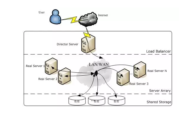 Server Array层:由一组实际运行应用服务的机器组成,Real Server可以是Web服务器、Mail服务器、FTP服务器、DNS服务器、视频服务器中的一个或者多个,每个Real Server之间通过高速的LAN或分布在各地的WAN相连接。在实际的应用中,Director Server也可以同时兼任Real Server的角色。