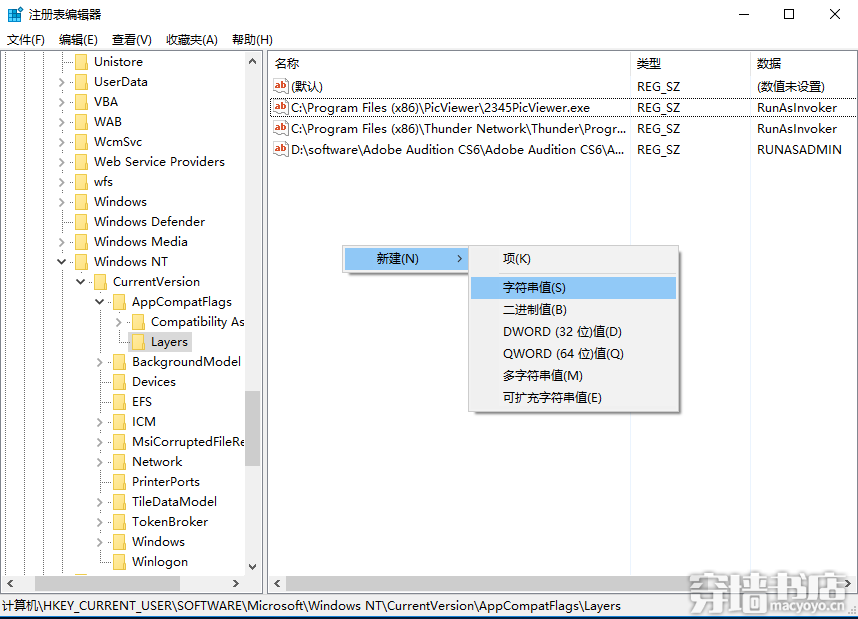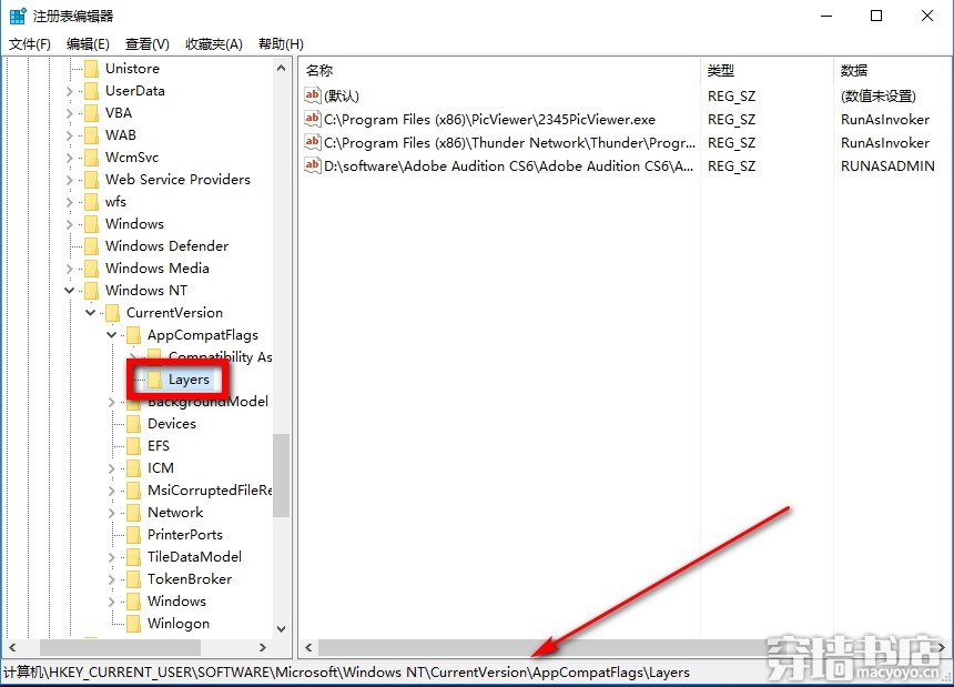 2、找到HKEY_CURRENT_USER\Software\Microsoft\Windows NT\CurrentVersion\AppCompatFlags\Layers(据说:windows10创意版1703可以直接在注册表地址栏粘贴导航至该位置,我的1607还没有这个功能)