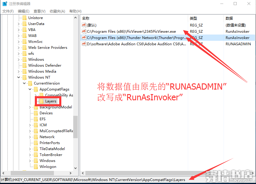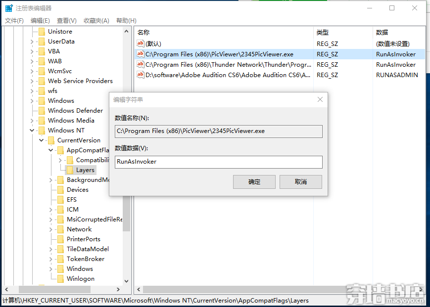 3、在右侧找到需要修改的应用程序对应的字符串值,双击打开修改参数,将数据值由原先的“RUNASADMIN”改写成“RunAsInvoker”,大小写无限制。(如果您的程序不在注册表内,可以跳过此步,看第4条。)