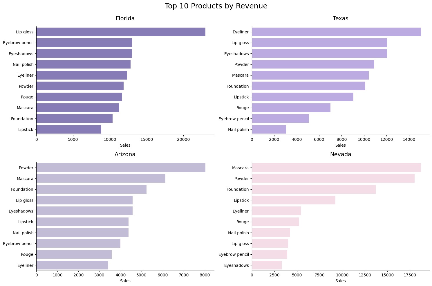 - Position: Bars represent cosmetics, ordered by sales, with horizontally arranged subplots for state comparisons.