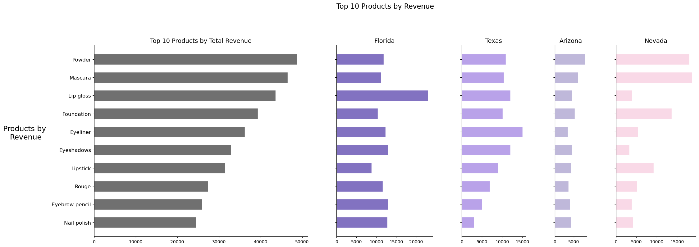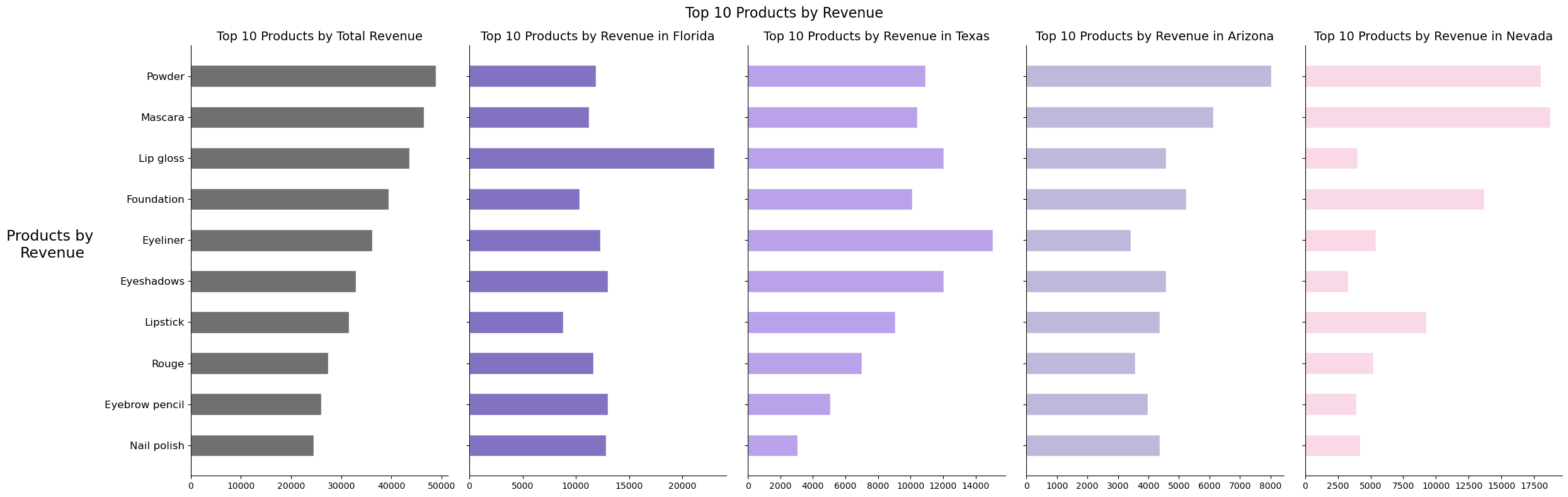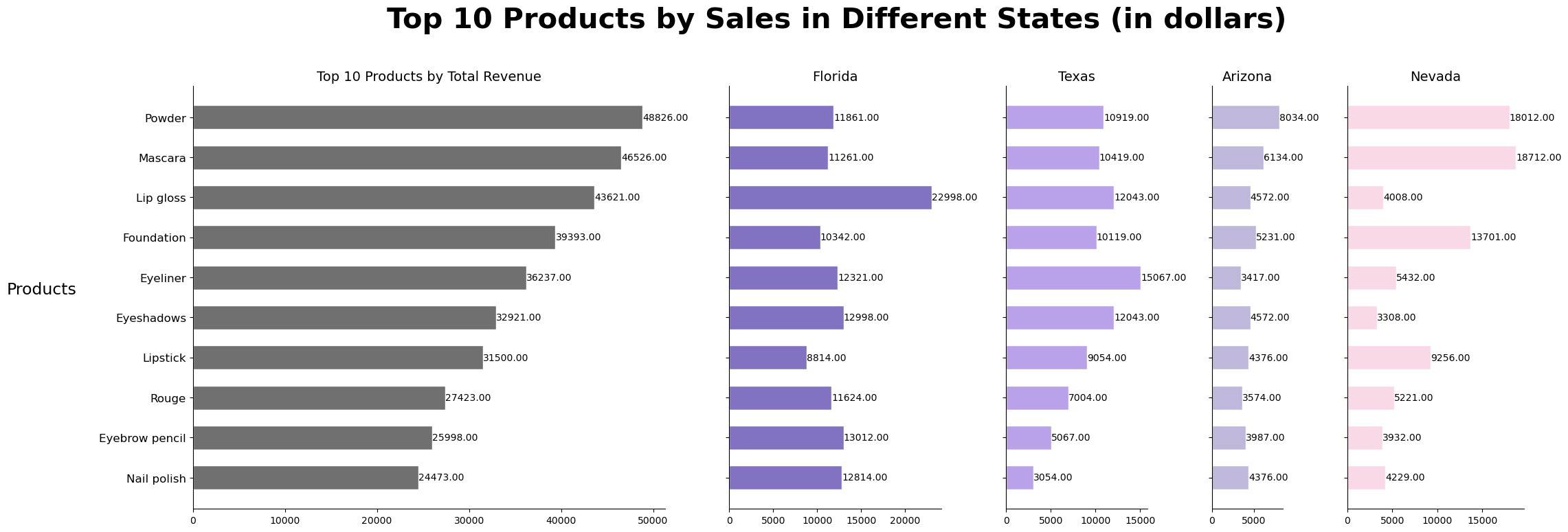 The original image presents the sales situation of cosmetics in different states in the form of a stacked bar chart. It is divided into five sections, depicting the specific sales data of the top 10 products ranked by total sales in Florida, Texas, Arizona, and Nevada. It helps the audience understand which products are more popular in different regions.