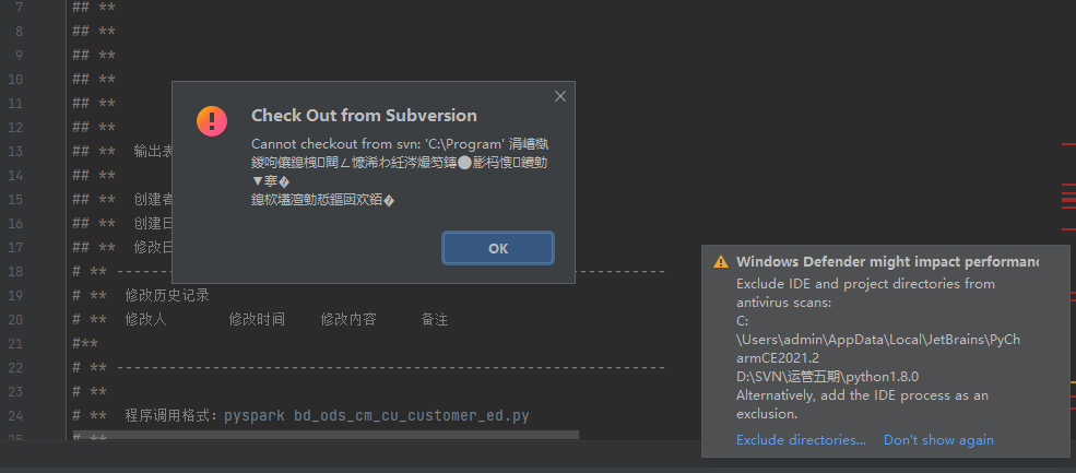 在IDEA 和PyCharm中都出现 check out from svn 出错