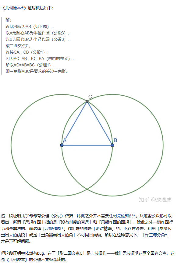 因为本文采取的公理化体系过于古老,因此这不是现代公理化的内容,但想学习现代公理化仍然需要以此作为跳板。比如本文采取欧几里得的公理体系,但后来被希尔伯特进行了重新定义。但是希尔伯特那本书基础的全没有(笑),可能还是要从欧几里得开始。近代也有研究欧氏几何的,可以继续研究,但是对中高考就没什么用了,(额可能数竞会有用?但是我好像对 \(MO\) 没那么感冒)。之所以选择几何原本而不是近欧,是因为我就是为了探索公理化体系,而不是更期望做题。
