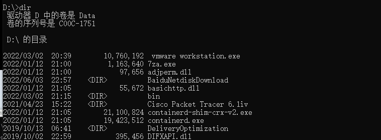 使用dir命令后,将会显示当前所在目录下的所有文件: