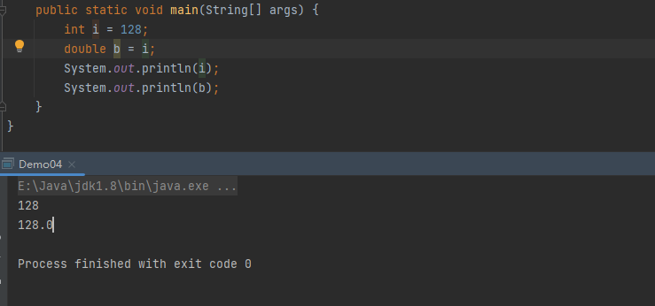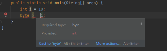 例子中的这两行代码是将int类型的i赋值给byte类型的b,是优先级高的类型转化为优先级低的类型,所以需要强制转换,不然就会出现下面的报错: