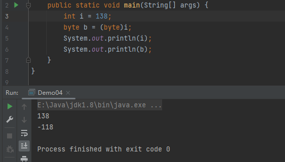 在例子中,b的值本应该是和i相同,等于138,但是因为byte类型的字节范围是-128 ~ 127,超出了byte的字节范围,发生了数据溢出。