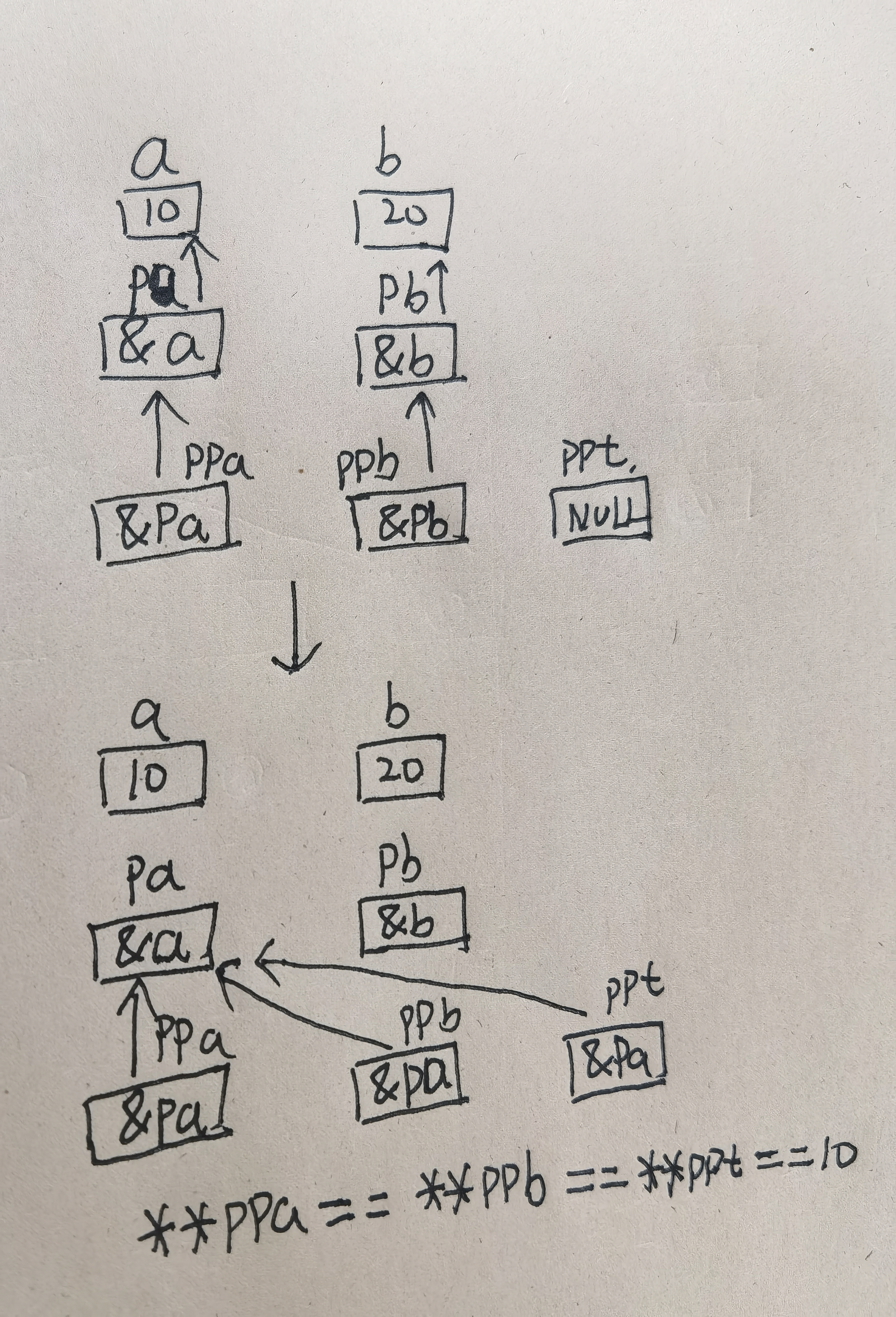 对二级指针进行两次解引用是一级指针指向的地址的数值,在这里**ppa的值就是a(也就是10)