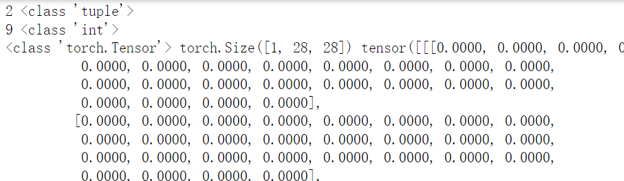 2. 数据(i[0])的type是tensor,shape是 [1,28,28],说明是一张28*28像素的灰度 ([1,28,28]里的1) 图片; 标签是int的9,说明这个图片代表9