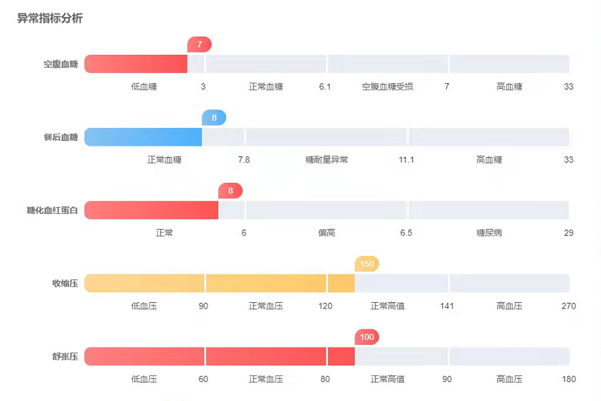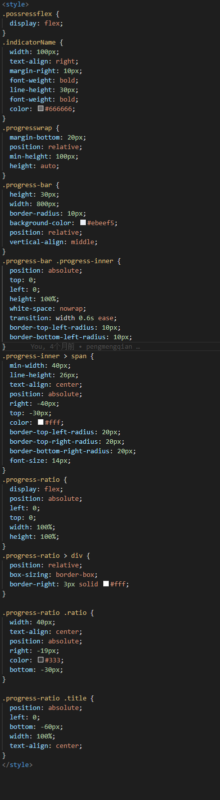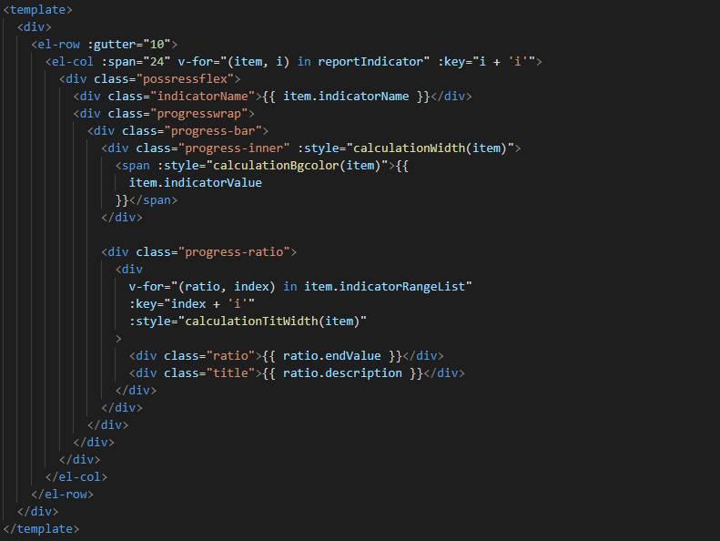 <template> <div> <el-row :gutter="10"> <el-col :span="24" v-for="(item, i) in reportIndicator" :key="i + 'i'"> <div class="possressflex"> <div class="indicatorName">{{ item.indicatorName }}</div> <div class="progresswrap"> <div class="progress-bar"> <div class="progress-inner" :style="calculationWidth(item)"> <span :style="calculationBgcolor(item)">{{ item.indicatorValue }}</span> </div> <div class="progress-ratio"> <div v-for="(ratio, index) in item.indicatorRangeList" :key="index + 'i'" :style="calculationTitWidth(item)" > <div class="ratio">{{ ratio.endValue }}</div> <div class="title">{{ ratio.description }}</div> </div> </div> </div> </div> </div> </el-col> </el-row> </div> </template> <script> export default { data() { return {}; }, computed: { calculationBgcolor() { return function (item) { // 方法二: 循环 let indicatorLevel item.indicatorRangeList.map((ele, idx) => { if ( item.indicatorValue >= ele.startValue && item.indicatorValue < ele.endValue ) indicatorLevel = ele.indicatorLevel }); return { background: this.headleBgcolor(indicatorLevel), }; }; }, calculationWidth() { return function (item) { var startValue; //开始值 var endValue; //结束值 var one = 100 / item.indicatorRangeList.length; // 值区间前宽度 var width; // 值宽度 var a; // 除数 var Level; var c; // 被除数 var bgColor; item.indicatorRangeList.forEach((ele, index) => { // 判断值区间 startValue = ele.startValue; endValue = ele.endValue; if (item.indicatorValue == endValue) { // 判断值等不等于区间结束值 width = one * (index + 1); bgColor = this.headleBgcolor(ele.indicatorLevel); } else if ( item.indicatorValue >= startValue && item.indicatorValue < endValue ) { a = item.indicatorValue - startValue; c = endValue - startValue; width = one * index + one * (a / c); bgColor = this.headleBgcolor(ele.indicatorLevel); } }); return { width: width + "%", background: bgColor, }; }; }, calculationTitWidth() { return function (item) { return { width: 100 / item.indicatorRangeList.length + "%", }; }; }, }, props: ["reportIndicator"], methods: { headleBgcolor(indicatorLevel) { let bgColor = null; if (indicatorLevel < 0) bgColor = "linear-gradient(90deg, #ffcf71, #ffb93a)"; else if (indicatorLevel == 0) bgColor = "linear-gradient(90deg, #5febc5, #3ecfa8)"; else bgColor = "linear-gradient(90deg, #fea6a6, #f66362)"; return bgColor; }, }, }; </script> <style> .possressflex { display: flex; } .indicatorName { width: 100px; text-align: right; margin-right: 10px; font-weight: bold; line-height: 30px; font-weight: bold; color: #666666; } .progresswrap { margin-bottom: 20px; position: relative; min-height: 100px; height: auto; } .progress-bar { height: 30px; width: 800px; border-radius: 10px; background-color: #ebeef5; position: relative; vertical-align: middle; } .progress-bar .progress-inner { position: absolute; top: 0; left: 0; height: 100%; white-space: nowrap; transition: width 0.6s ease; border-top-left-radius: 10px; border-bottom-left-radius: 10px; } .progress-inner > span { min-width: 40px; line-height: 26px; text-align: center; position: absolute; right: -40px; top: -30px; color: #fff; border-top-left-radius: 20px; border-top-right-radius: 20px; border-bottom-right-radius: 20px; font-size: 14px; } .progress-ratio { display: flex; position: absolute; left: 0; top: 0; width: 100%; height: 100%; } .progress-ratio > div { position: relative; box-sizing: border-box; border-right: 3px solid #fff; } .progress-ratio .ratio { width: 40px; text-align: center; position: absolute; right: -19px; color: #333; bottom: -30px; } .progress-ratio .title { position: absolute; left: 0; bottom: -60px; width: 100%; text-align: center; } </style>