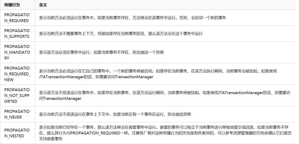 事务属性定义:配置事务的一些基本属性,描述了事务策略如何应用到方法上,接口定义如下,具体包括以下属性: