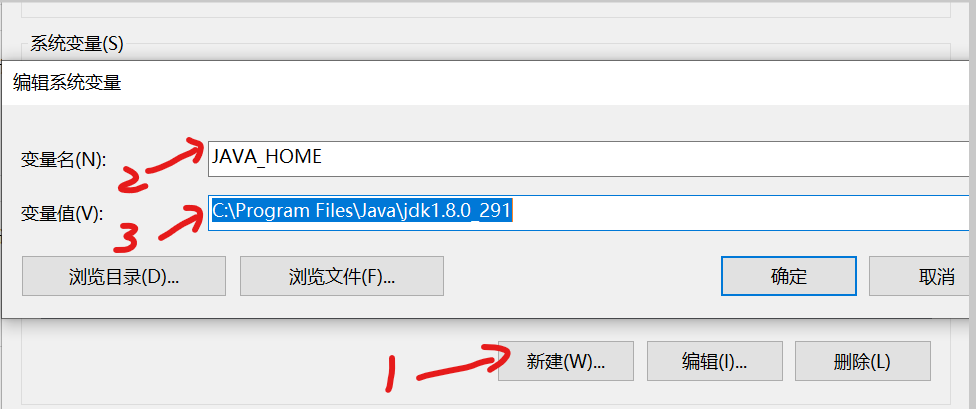 3.在系统变量中,新建环境变量,变量名为:JAVA_HOME;变量值为安装的路径:C:\Program Files\Java\jdk1.8.0_291;