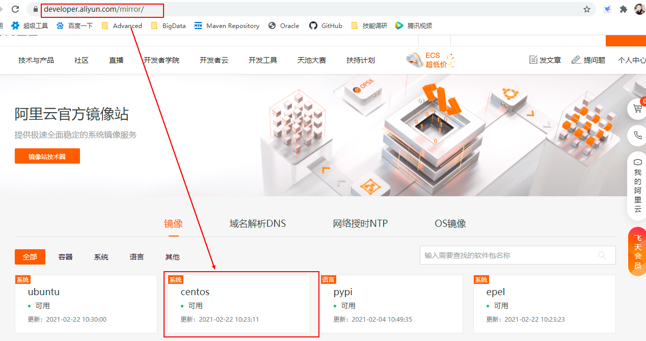 2、查询国内镜像源 —— 打开阿里镜像http://mirrors.aliyun.com/ —— 找到当前Linux系统对应的版本