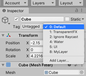 例:新建一个Cube,点击Cube,此时Inspector右上角的Layer是default。