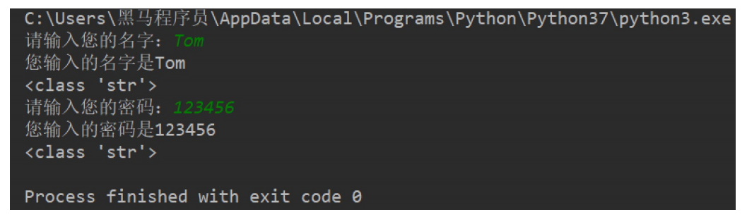 name = input('请输⼊您的名字:') print(f'您输⼊的名字是{name}') print(type(name)) password = input('请输⼊您的密码:') print(f'您输⼊的密码是{password}') print(type(password))