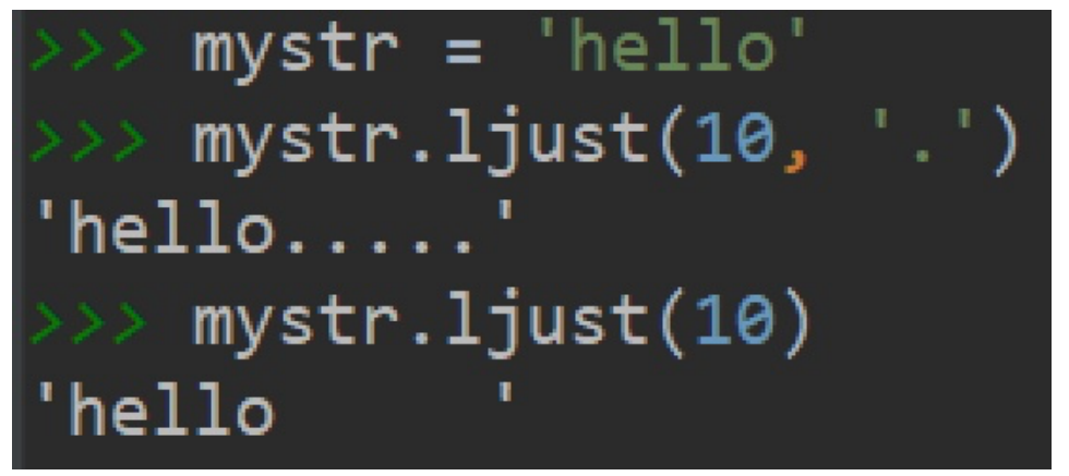 ljust():返回⼀个原字符串左对⻬,并使⽤指定字符(默认空格)填充⾄对应⻓度 的新字符串。