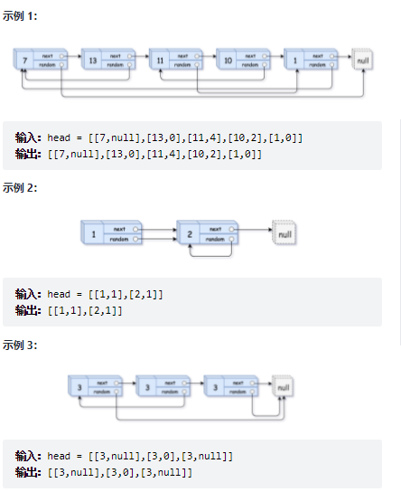 构造这个链表的 深拷贝。 深拷贝应该正好由 n 个 全新 节点组成,其中每个新节点的值都设为其对应的原节点的值。新节点的 next 指针和 random 指针也都应指向复制链表中的新节点,并使原链表和复制链表中的这些指针能够表示相同的链表状态。复制链表中的指针都不应指向原链表中的节点 。