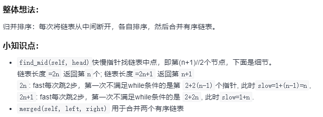 class Solution: # 归并排序 def sortList(self, head: ListNode) -> ListNode: if not head or not head.next: return head left_end = self.find_mid(head) mid = left_end.next left_end.next = None left, right = self.sortList(head), self.sortList(mid) return self.merged(left, right) # 快慢指针查找链表中点 def find_mid(self, head): if head is None or head.next is None: return head slow,fast = head, head.next while fast is not None and fast.next is not None: slow=slow.next fast=fast.next.next return slow # 合并有序链表 def merged(self, left, right): res = ListNode() h = res while left and right: if left.val < right.val: h.next, left = left, left.next else: h.next, right = right, right.next h = h.next h.next = left if left else right return res.next 作者:yuer-flyfly 链接:https://leetcode-cn.com/problems/sort-list/solution/pai-xu-lian-biao-gui-bing-pai-xu-kuai-ma-2v1b/ 来源:力扣(LeetCode) 著作权归作者所有。商业转载请联系作者获得授权,非商业转载请注明出处。