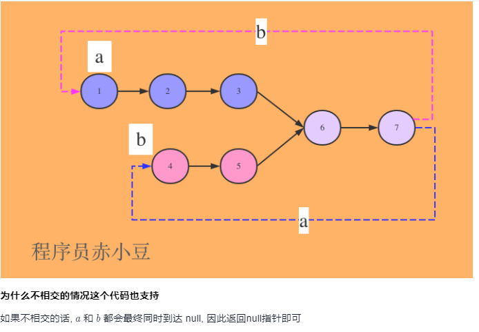 假设headA, headB是有交点的, 他们整个移动的路径像一个 8 字. 我觉得这个有点像莫比乌斯环~, 两个指针的起始位置虽然不一样, 但是大家的走的步伐是一致的, 而且朝着相交的点在移动, 于是可以相遇. 画一个图来理解一下可能更加清晰.