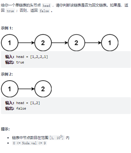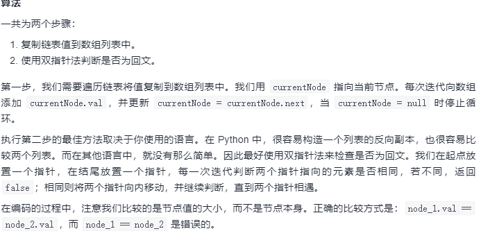 class Solution: def isPalindrome(self, head: ListNode) -> bool: vals = [] current_node = head while current_node is not None: vals.append(current_node.val) current_node = current_node.next return vals == vals[::-1] 作者:LeetCode-Solution 链接:https://leetcode-cn.com/problems/palindrome-linked-list/solution/hui-wen-lian-biao-by-leetcode-solution/ 来源:力扣(LeetCode) 著作权归作者所有。商业转载请联系作者获得授权,非商业转载请注明出处。