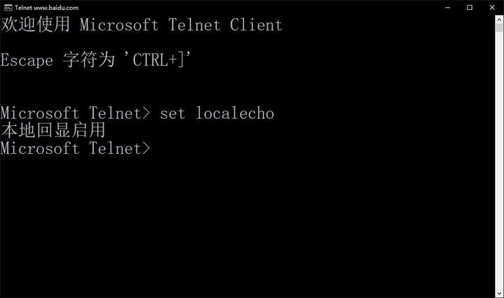 - 输入”telnet”,回车,输入set(空格) localecho打开本地回显功能。