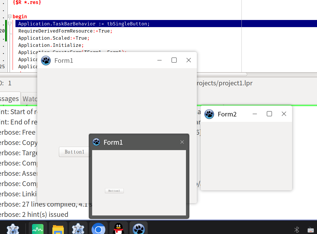 program project1; {$mode objfpc}{$H+} uses {$IFDEF UNIX} cthreads, {$ENDIF} {$IFDEF HASAMIGA} athreads, {$ENDIF} Interfaces, // this includes the LCL widgetset Forms, unit1, unit2 { you can add units after this }; {$R *.res} begin Application.TaskBarBehavior := tbSingleButton; RequireDerivedFormResource:=True; Application.Scaled:=True; Application.Initialize; Application.CreateForm(TForm1, Form1); Application.CreateForm(TForm2, Form2); Application.Run; end.