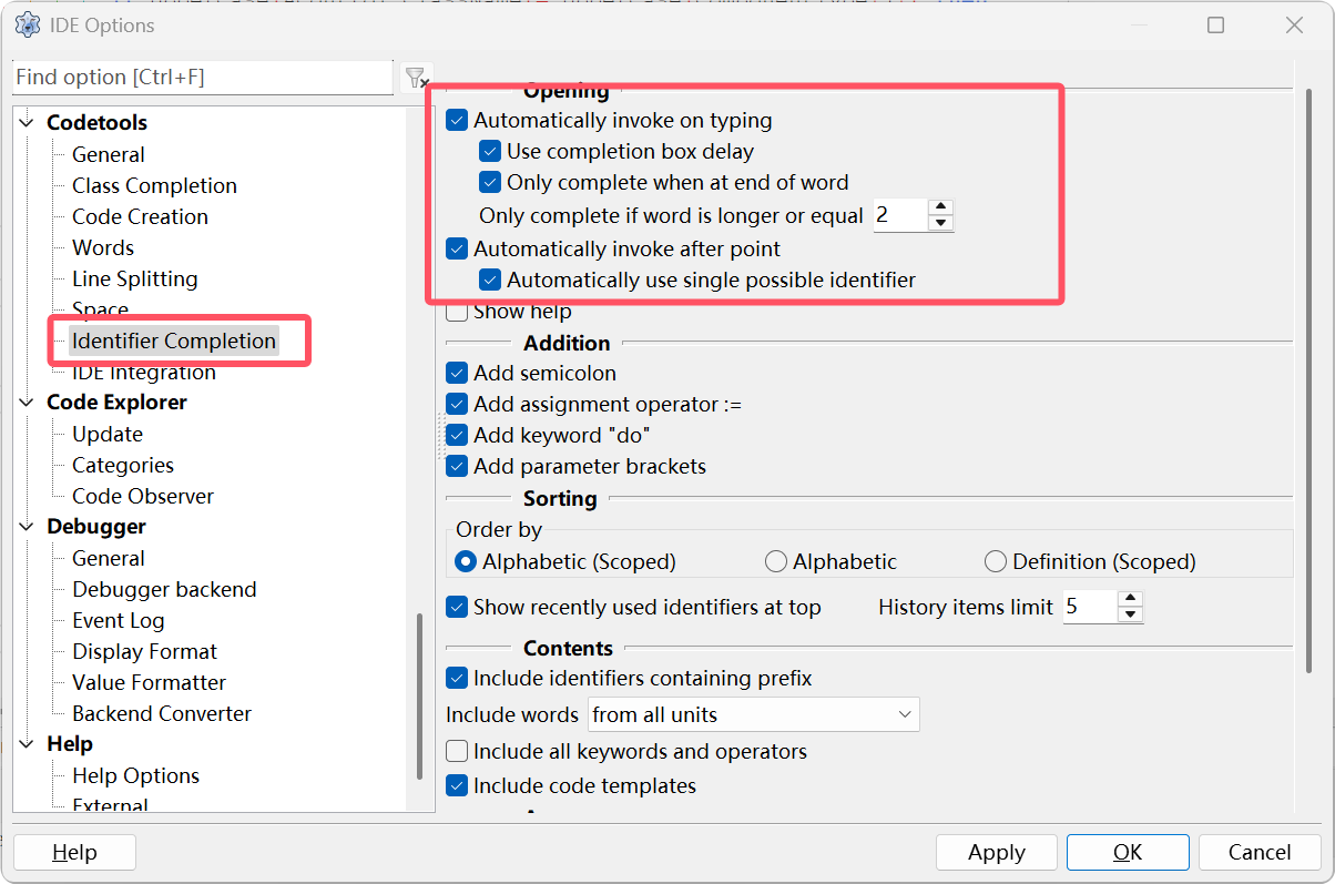 1、Tools-->Options-->Codetools-->identifier Comletion-->勾选Automatically invoke on typing