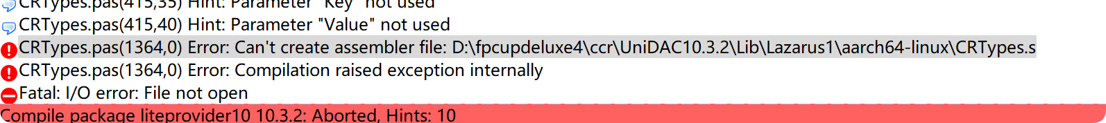 CRTypes.pas(1364,0) Error: Can't create assembler file: D:\fpcupdeluxe4\ccr\UniDAC10.3.2\Lib\Lazarus1\aarch64-linux\CRTypes.s CRTypes.pas(1364,0) Error: Compilation raised exception internally Fatal: I/O error: File not open