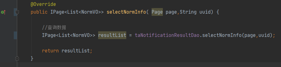 实例化Page对象page1,把分页的页数和每页条数存入这个对象中,然后实例化IPage对象ipage,这时候一定要注意!!page1作为入参在这里一定要放在第一位,就是如图中所示的位置。否则会出现异常,详情请看我写的另外一篇专门记录这个坑的文章。