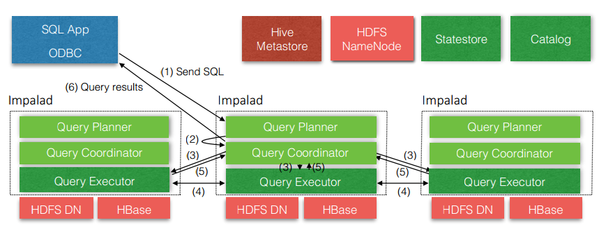 在真正介绍Impala查询执行流程之前,需要先贴上一张Impala的架构图镇楼,下图中描述了一个SQL查询的执行流程。