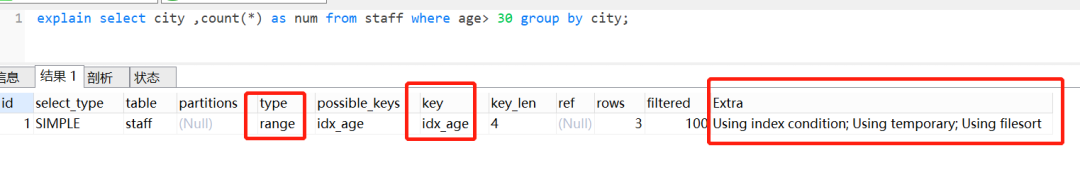 从explain 执行计划结果,可以发现查询条件命中了idx_age的索引,并且使用了临时表和排序
