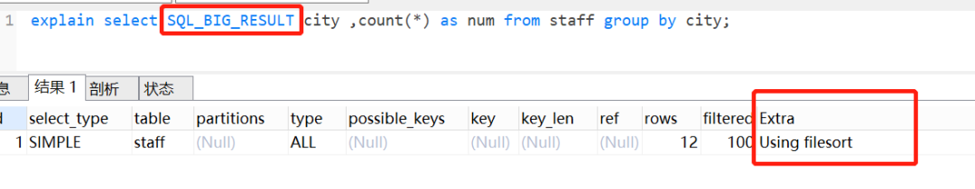 select SQL_BIG_RESULT city ,count(*) as num from staff group by city;